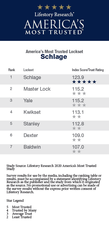 The Lifestory Research 2020 America’s Most Trusted® Lockset Brand Study identified Schlage as the most trusted brand among people considering the purchase of a lockset for their home. Schlage generated a Net Trust Quotient Score of 123.9 and the 5 Star Trust Rating among people actively shopping a lockset. What are the best lockset door hardware brands? The most trusted lockset brands, in order, were Schlage, Master Lock, Yale, Kwikset, Stanley, Dexter, and Baldwin. Schlage received the best reviews and trust ratings among the most popular lockset door hardware brands as judged by consumers. See the table for trust scores and the most trusted ratings of the most popular door handles and lockset brands included in the 2020 study.